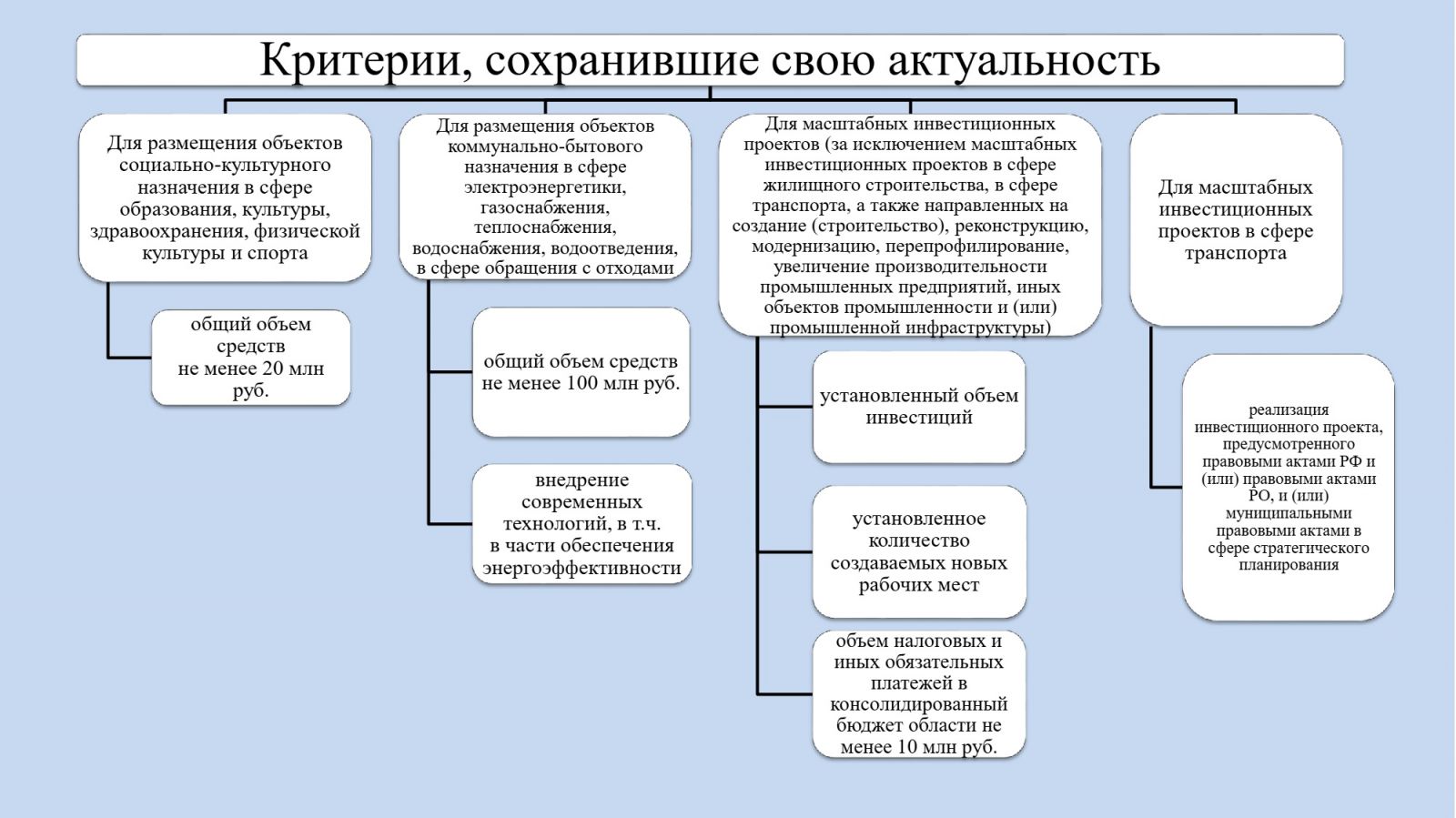 установление критериев, которым должны соответствовать масштабные инвестиционные проекты, направленные на создание (строительство), реконструкцию, модернизацию, перепрофилирование, увеличение производительности промышленных предприятий, иных объектов промышленности и (или) промышленной инфраструктуры;