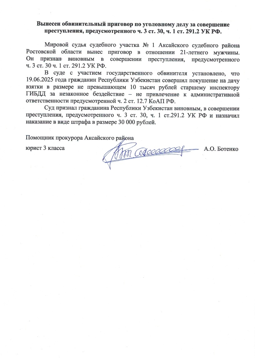 Вынесен обвинительный приговор по уголовному делу за совершение преступления, предусмотренного ч 3. ст.30, ч. 1 ст. 291.2 УК РФ